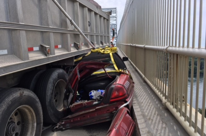 The bridge had to be temporarily shut down while a heavy-duty tow truck lifted the truck off the car and the scene was cleared.